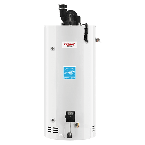 Gaint gas-fired water heaters include a powerful blower assembly. No chimney required, simply vent through the roof or an exterior wall. These models come with Intelli-Vent™ electronic gas control that allows precision temperature control and history tracking using error codes.